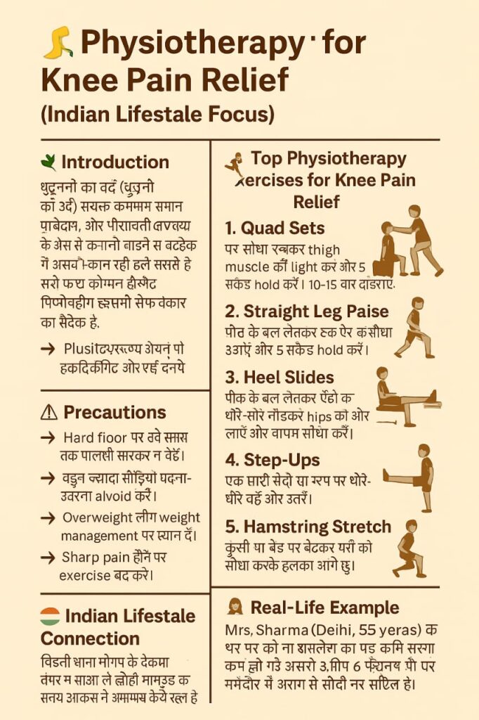 Knee pain рднрд╛рд░рдд рдореЗрдВ рд▓рд╛рдЦреЛрдВ рд▓реЛрдЧреЛрдВ рдХреА daily life рдХреЛ impact рдХрд░рддрд╛ рд╣реИред Physiotherapy exercises safe, effective рдФрд░ long-term solution рджреЗрддреА рд╣реИрдВред Lifestyle рдореЗрдВ рдЫреЛрдЯреЗ-рдЫреЛрдЯреЗ рдмрджрд▓рд╛рд╡ рдФрд░ regular exercises рдШреБрдЯрдиреЛрдВ рдХреА рд╕реЗрд╣рдд рдмрдирд╛рдП рд░рдЦрдиреЗ рдХрд╛ рд╕рдмрд╕реЗ рдЕрдЪреНрдЫрд╛ рддрд░реАрдХрд╛ рд╣реИред