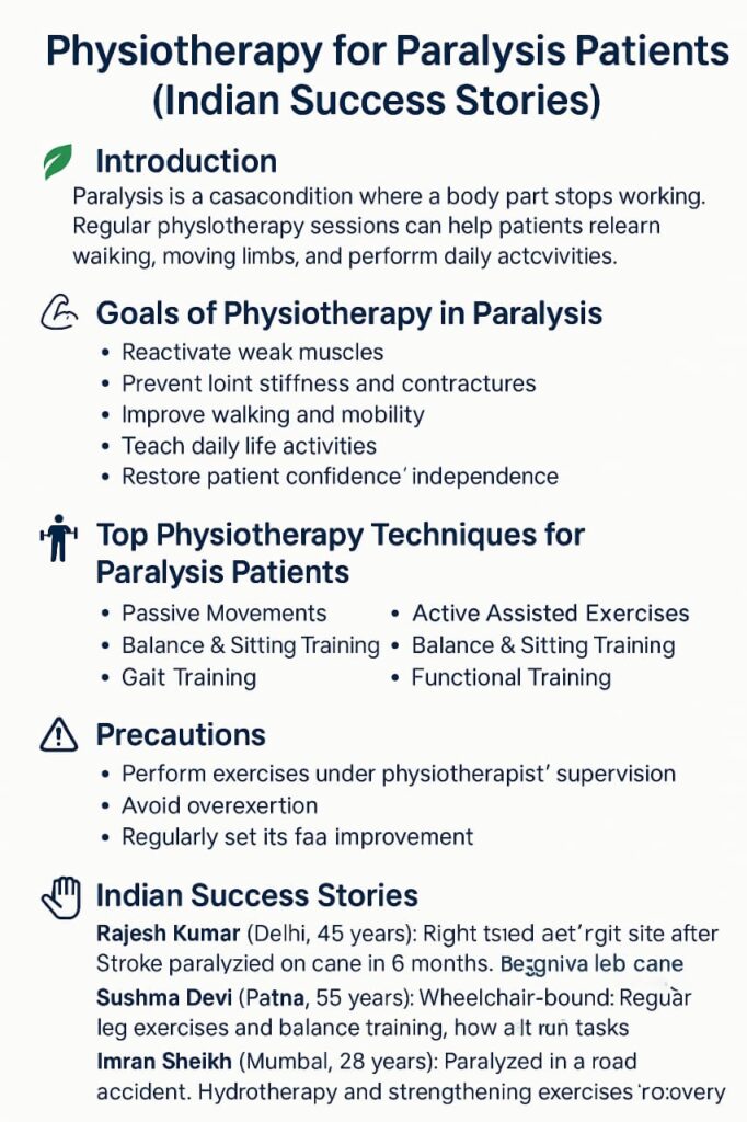 1. Rajesh Kumar (Delhi, 45 years): Stroke के बाद right side paralyzed हो गया। Daily physiotherapy (passive + gait training) से 6 महीनों में walking stick के साथ चलने लगे।